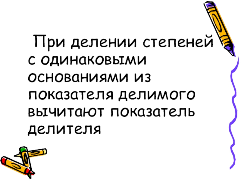 Слайд 11 При делении степеней с одинаковыми основаниями из показателя