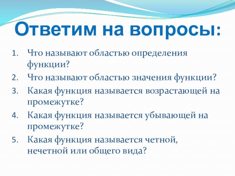 Ответим на вопросы:Что называют областью определения функции?Что называют областью значения функции?Какая функция называется возрастающей на промежутке?Какая функция