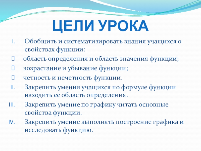 Обобщить и систематизировать знания учащихся о свойствах функции:
