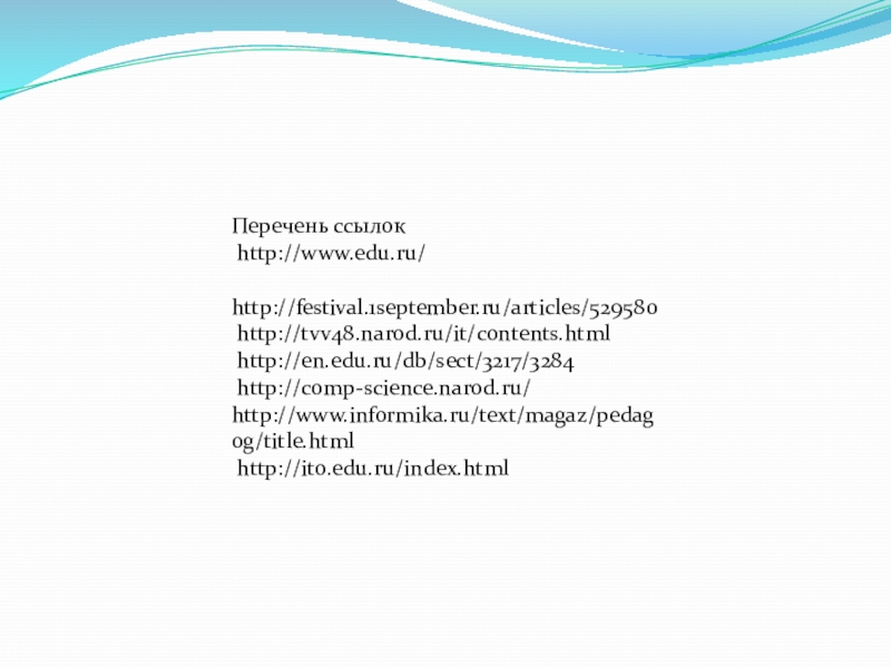 Перечень ссылок http://www.edu.ru/ http://festival.1september.ru/articles/529580 http://tvv48.narod.ru/it/contents.html http://en.edu.ru/db/sect/3217/3284 http://comp-science.narod.ru/ http://www.informika.ru/text/magaz/pedagog/title.html http://ito.edu.ru/index.html