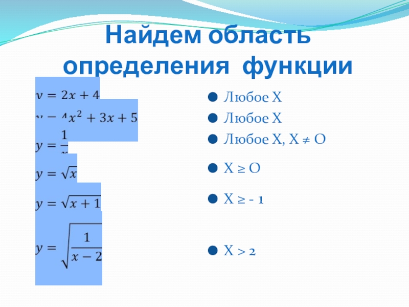 Найдем область определения функцииЛюбое ХЛюбое ХЛюбое Х, Х ≠ ОХ ≥ OX ≥ - 1X > 2