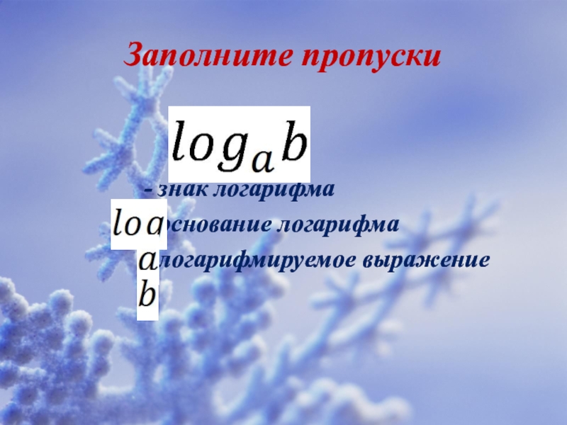 Заполните пропуски												, где 	  		  			  - знак логарифма			  - основание логарифма