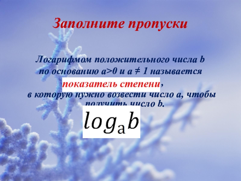 Заполните пропускиЛогарифмом положительного числа b по основанию а>0 и а ≠ 1 называется