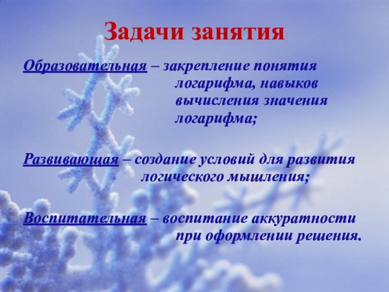 Задачи занятияОбразовательная – закрепление понятия логарифма, навыков вычисления значения логарифма;Развивающая – создание условий для развития логического мышления;Воспитательная – воспитание аккуратности при оформлении решения.