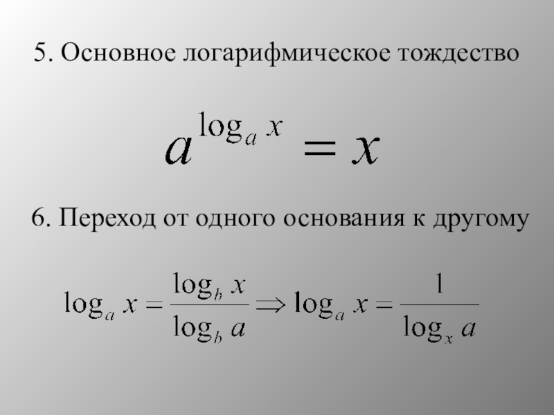 5. Основное логарифмическое тождество6. Переход от одного основания к другому