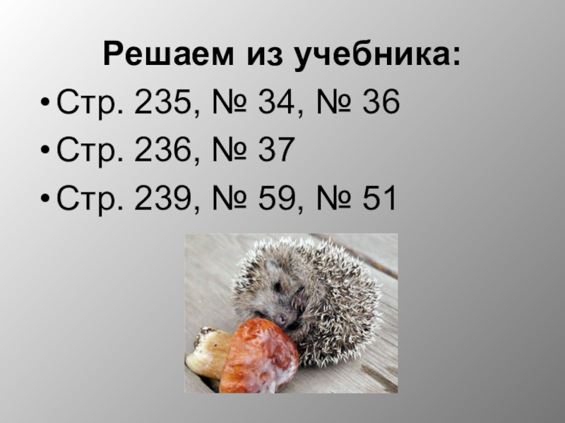Решаем из учебника:Стр. 235, № 34, № 36Стр. 236, № 37Стр. 239, № 59, № 51