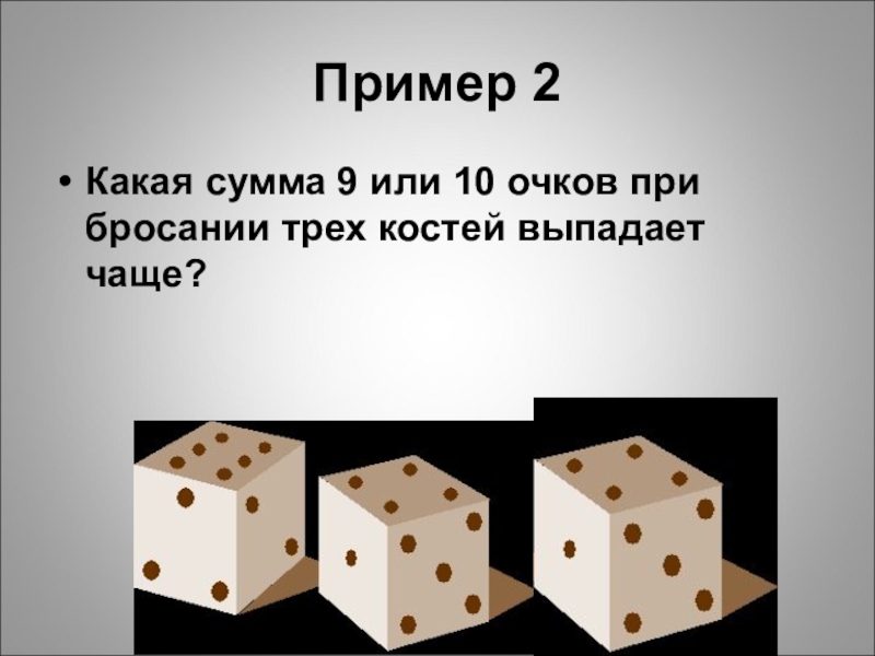 Пример 2Какая сумма 9 или 10 очков при бросании трех костей выпадает чаще?