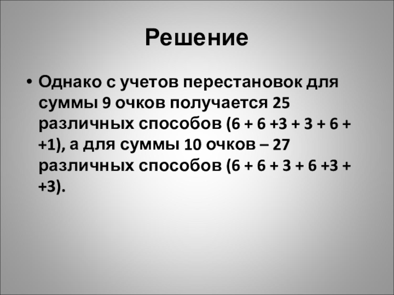 Однако с учетов перестановок для суммы 9 очков получается 25 различных