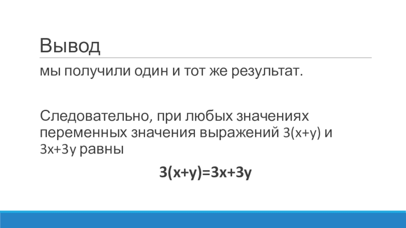 Выводмы получили один и тот же результат. Следовательно, при любых значениях переменных значения выражений 3(x+y) и 3x+3y