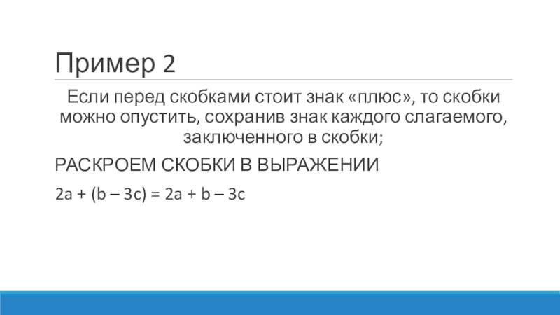 Пример 2Если перед скобками стоит знак «плюс», то скобки можно опустить, сохранив знак каждого слагаемого, заключенного в