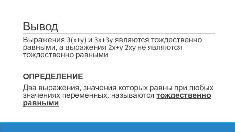 Вывод Выражения 3(x+y) и 3x+3y являются тождественно равными, а выражения 2x+y 2xy не являются тождественно равнымиОПРЕДЕЛЕНИЕДва выражения,