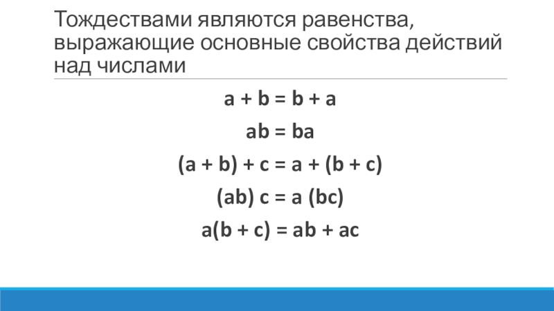 Слайд 7Тождествами являются равенства, выражающие основные свойства действий над числами