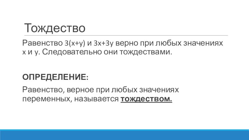 Тождество Равенство 3(x+y) и 3x+3y верно при любых значениях x и y. Следовательно они тождествами. ОПРЕДЕЛЕНИЕ:Равенство, верное
