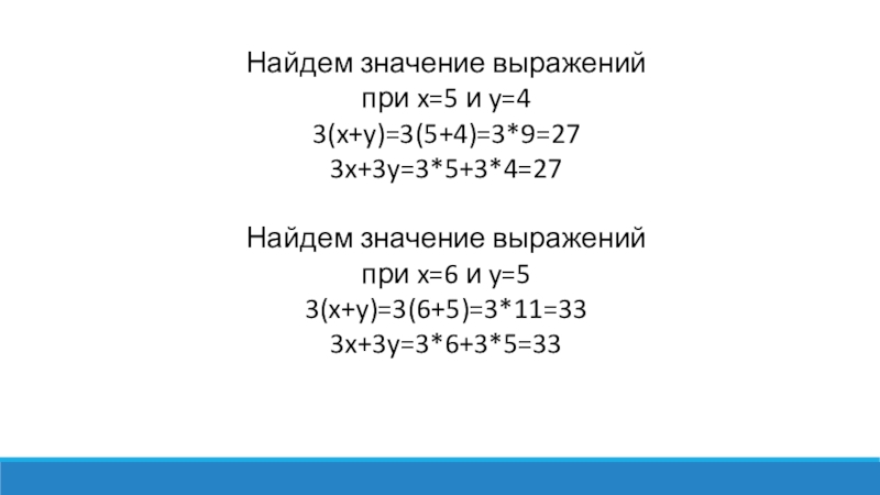 Найдем значение выражений при x=5 и y=43(x+y)=3(5+4)=3*9=273x+3y=3*5+3*4=27Найдем значение выраженийпри x=6 и y=53(x+y)=3(6+5)=3*11=333x+3y=3*6+3*5=33