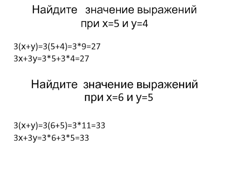 Найдите  значение выражений  при х=5 и у=4 3(х+у)=3(5+4)=3*9=273х+3у=3*5+3*4=27Найдите значение выражений  при х=6 и у=53(х+у)=3(6+5)=3*11=333х+3у=3*6+3*5=33