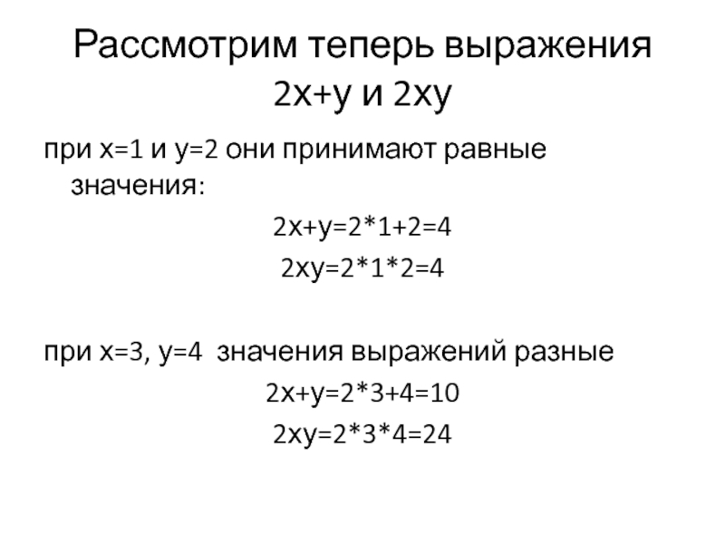 Рассмотрим теперь выражения 2х+у и 2хупри х=1 и у=2 они принимают равные значения:2х+у=2*1+2=42ху=2*1*2=4при х=3, у=4 значения выражений
