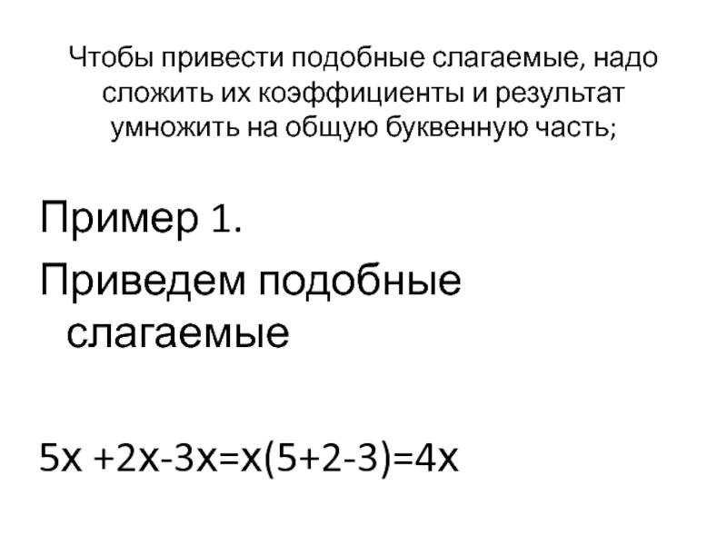 Чтобы привести подобные слагаемые, надо сложить их коэффициенты и результат умножить на общую буквенную часть; Пример 1.