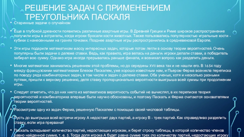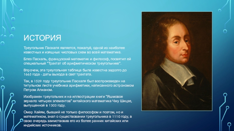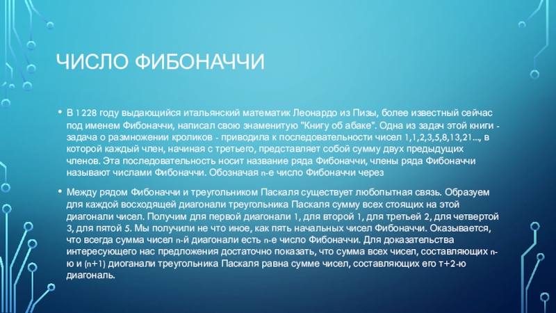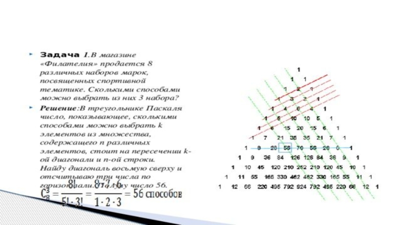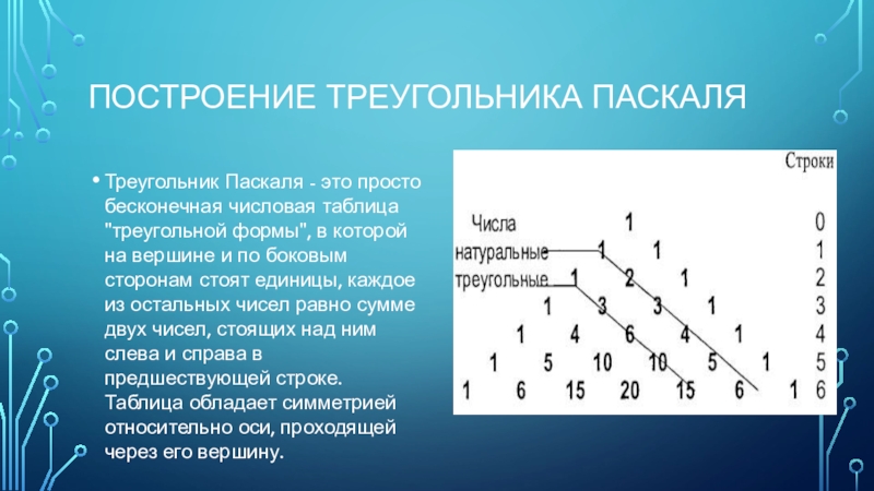 Вдоль диагоналей, параллельных сторонам треугольника, выстроены треугольные, тетраэдрические и другие числа. Треугольные числа указывают количество шаров или других предметов, уложенных в виде треугольника (эти числа образуют следующую последовательность: 1,3,6,10,15,21,..., в которой 1- первое треугольное число, 3- второе треугольное число, 6-третье и т. д. до m-ro, которое показывает, сколько членов треугольника Паскаля содержится в первых m его строках - от нулевой до (m-1)-й).