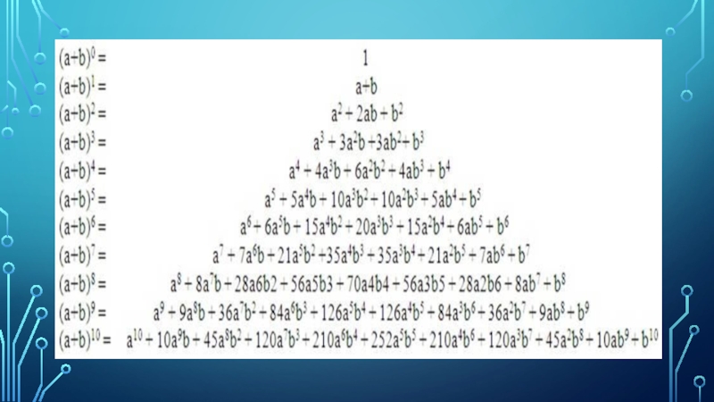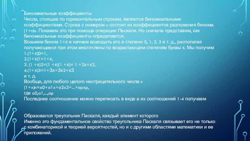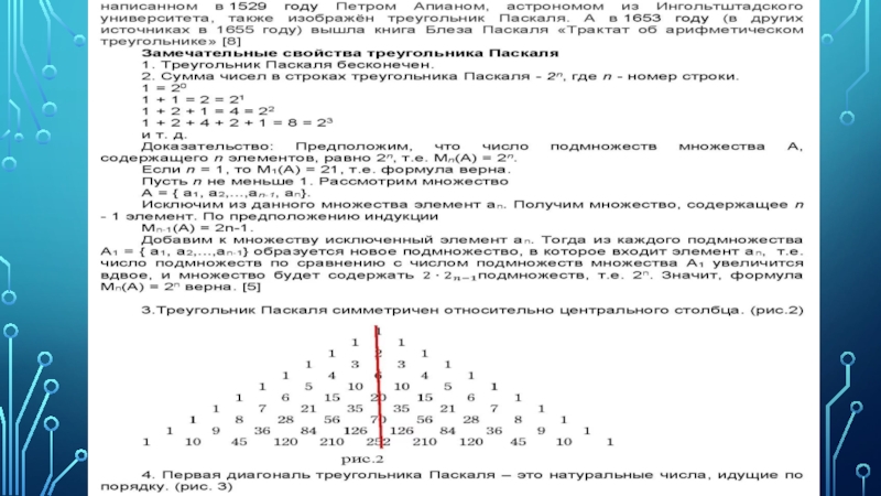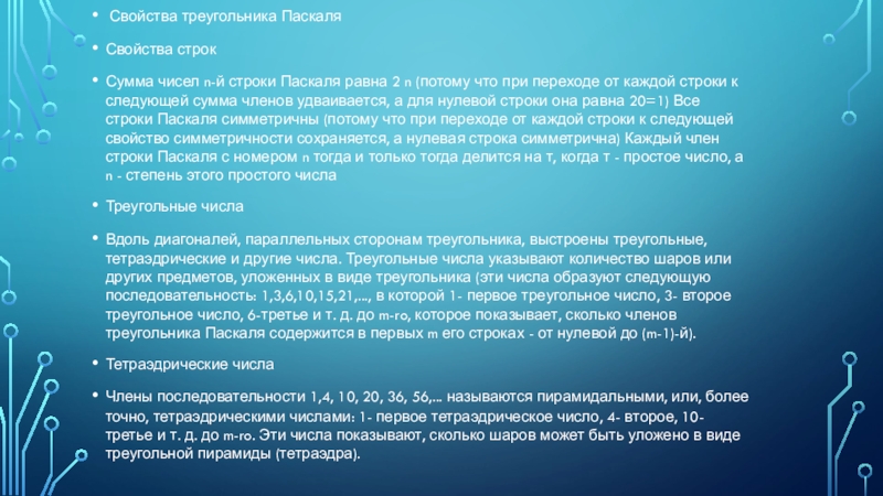 2 n (потому что при переходе от каждой строки к следующей сумма членов удваивается, а для нулевой строки она равна 20=1) Все строки Паскаля симметричны (потому что при переходе от каждой строки к следующей свойство симметричности сохраняется, а нулевая строка симметрична) Каждый член строки Паскаля с номером n тогда и только тогда делится на т, когда т - простое число, а n - степень этого простого числа