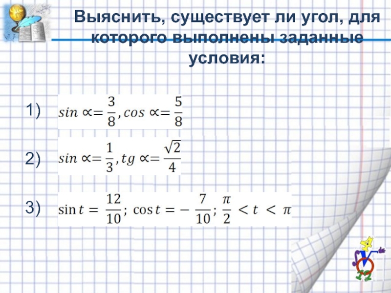 Слайд 3Выяснить, существует ли угол, для которого выполнены заданные условия:
