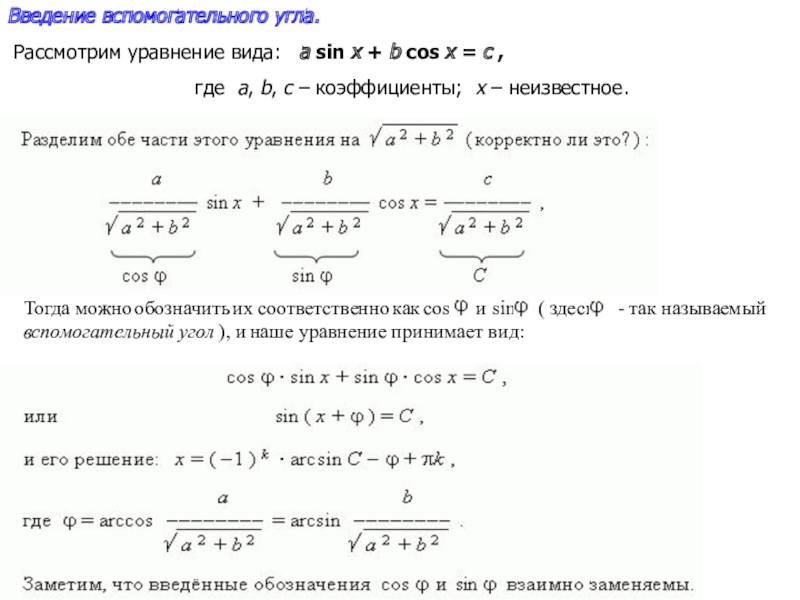 Тогда можно обозначить их соответственно как cos и sin ( здесь - так называемый вспомогательный угол ), и наше уравнение принимает вид: