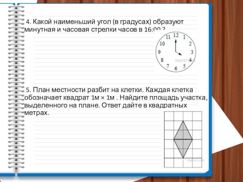4. Какой наи­мень­ший угол (в градусах) об­ра­зу­ют минутная и ча­со­вая стрелки часов в 16:00 ?   5. План мест­но­сти раз­бит