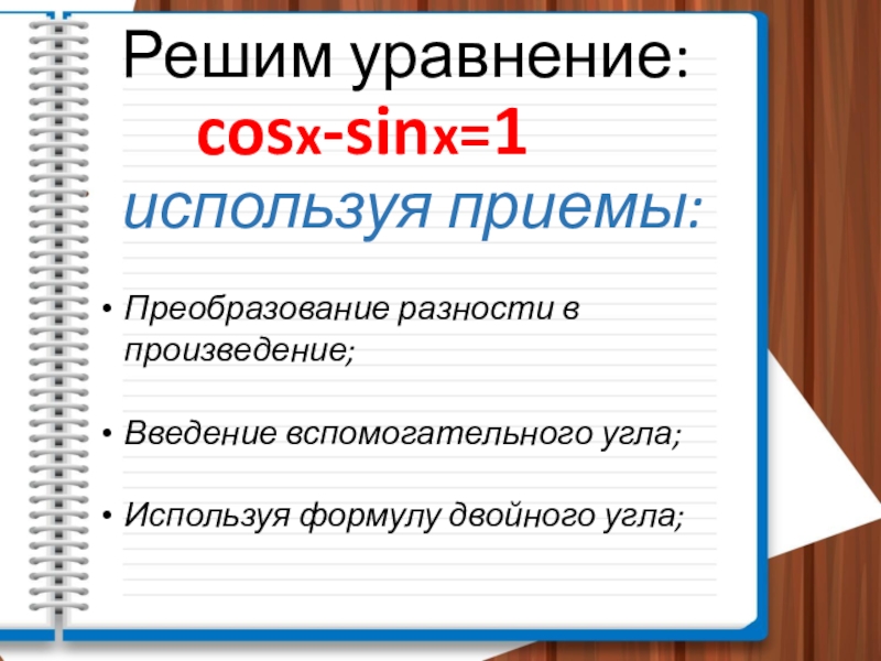 Решим уравнение:    cosx-sinx=1 используя приемы:Преобразование разности в произведение;Введение вспомогательного угла;Используя формулу двойного угла;