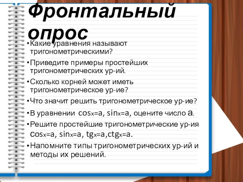 Фронтальный опросКакие уравнения называют тригонометрическими?Приведите примеры простейших тригонометрических ур-ий.Сколько корней может иметь тригонометрическое ур-ие?Что значит решить тригонометрическое
