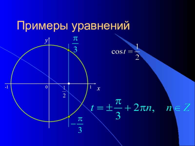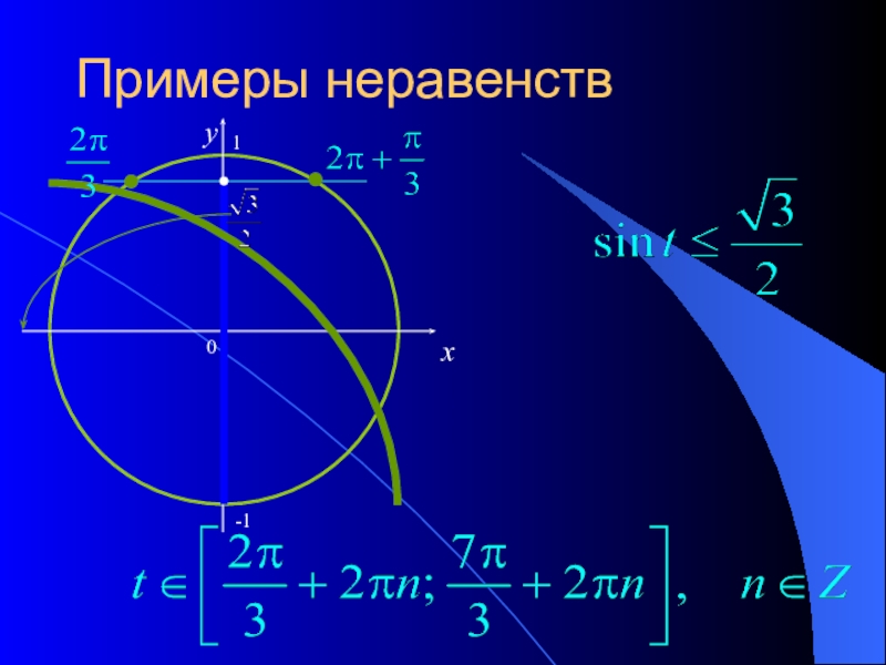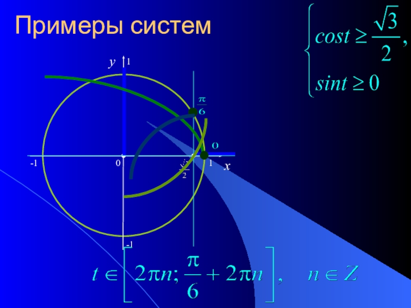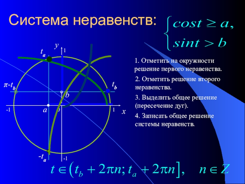 Система неравенств:0xyata-ta-11btbπ-tb1-11. Отметить на окружности решение первого неравенства.2. Отметить решение второго неравенства.3. Выделить общее решение (пересечение дуг).4.