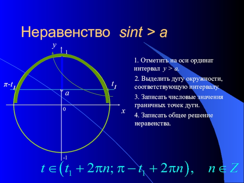 Неравенство sint > a0xy1. Отметить на оси ординат интервал y > a.2. Выделить дугу окружности, соответствующую интервалу.3.