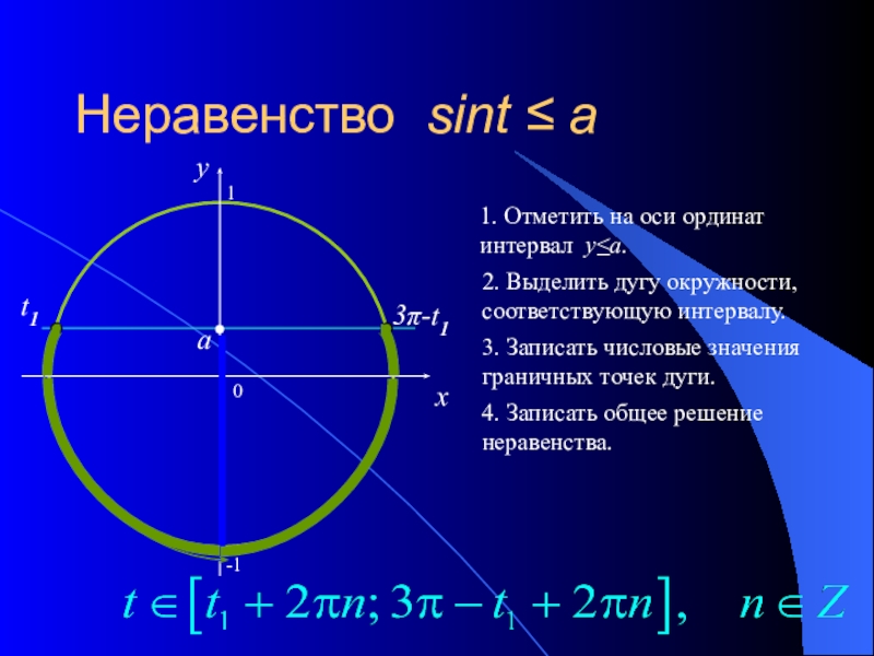 Неравенство sint ≤ a0xy1. Отметить на оси ординат интервал y≤a.2. Выделить дугу окружности, соответствующую интервалу.3. Записать числовые