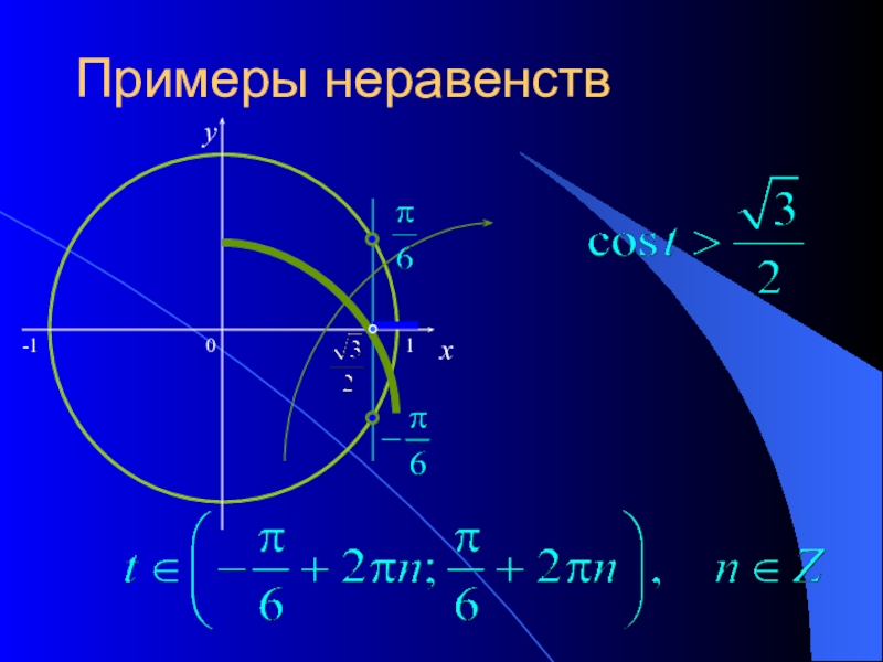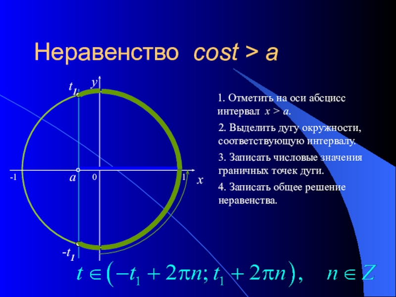 Неравенство cost > a0xy1. Отметить на оси абсцисс интервал x > a.2. Выделить дугу окружности, соответствующую интервалу.3.