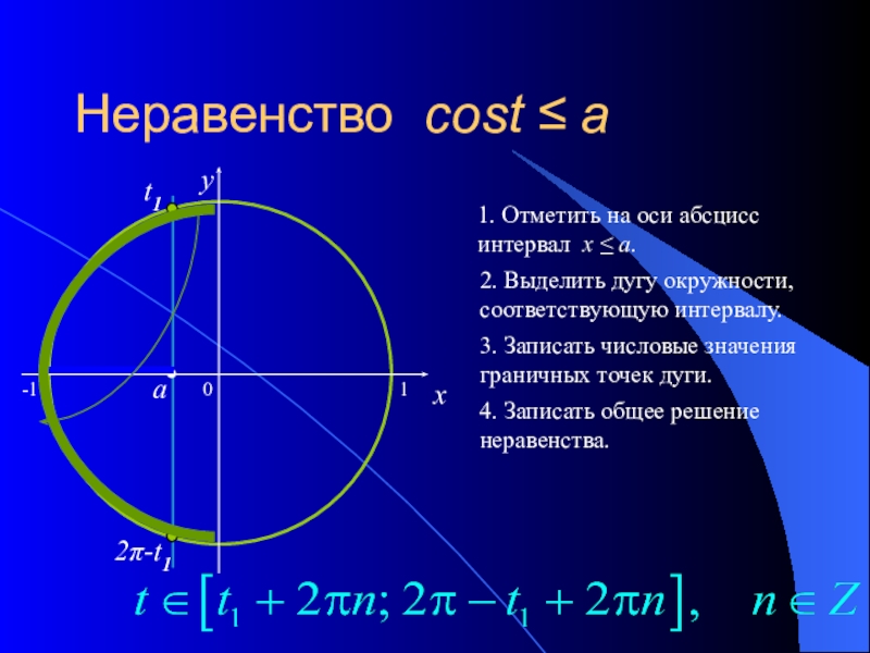 Неравенство cost ≤ a0xy1. Отметить на оси абсцисс интервал x ≤ a.2. Выделить дугу окружности, соответствующую интервалу.3.