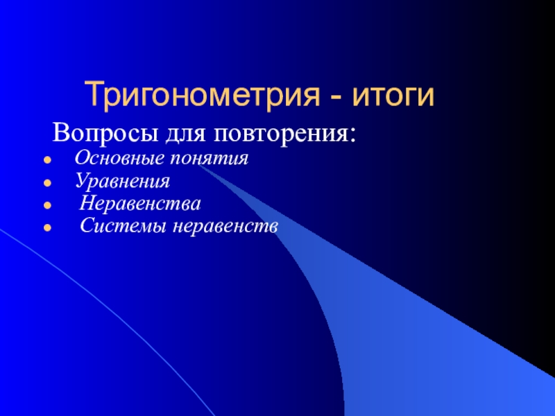 Тригонометрия - итогиВопросы для повторения:  Основные понятия  Уравнения   Неравенства   Системы неравенств