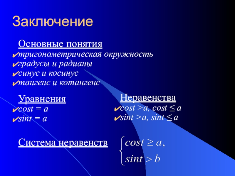 ЗаключениеОсновные понятиятригонометрическая окружность градусы и радианысинус и косинустангенс и котангенсУравненияcost = asint = aНеравенстваcost >a, cost ≤