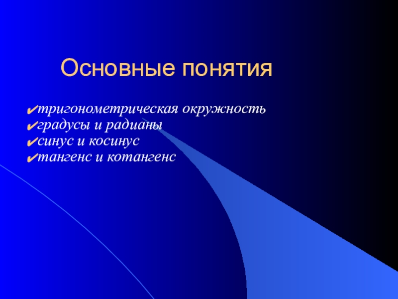 Основные понятиятригонометрическая окружность градусы и радианысинус и косинустангенс и котангенс