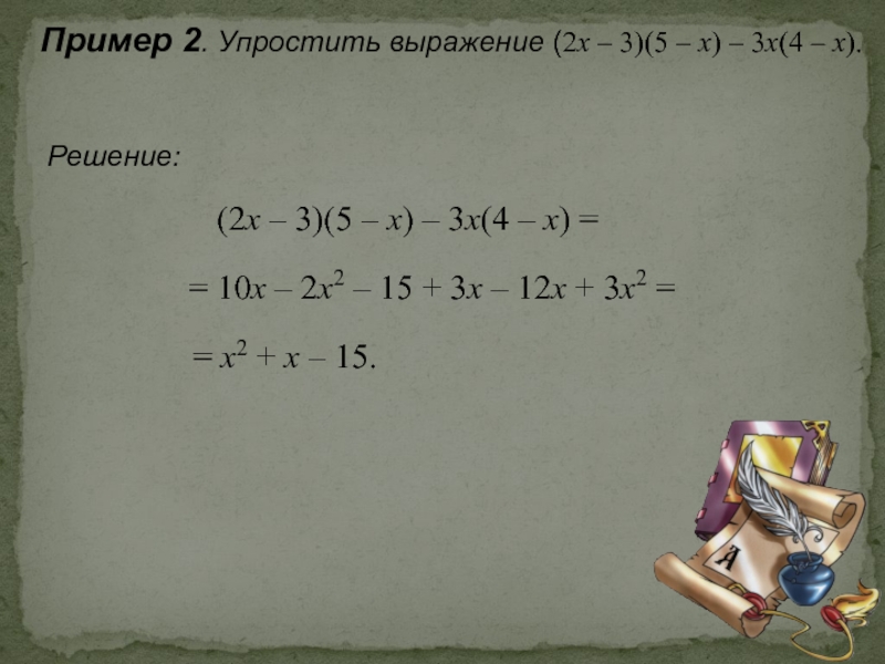 (2х – 3)(5 – х) – 3х(4 – х) =