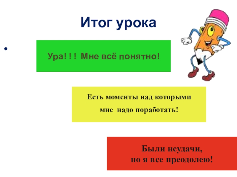 Итог урока Ура! ! ! Мне всё понятно!Есть моменты над которыми мне надо поработать!Были неудачи, но я