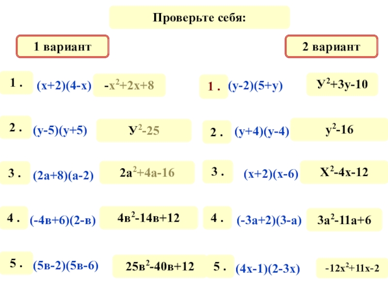 1 вариант2 вариантПроверьте себя:-х2+2х+8У2-252а2+4а-164в2-14в+1225в2-40в+12У2+3у-10у2-163а2-11а+6-12х2+11х-2Х2-4х-12
