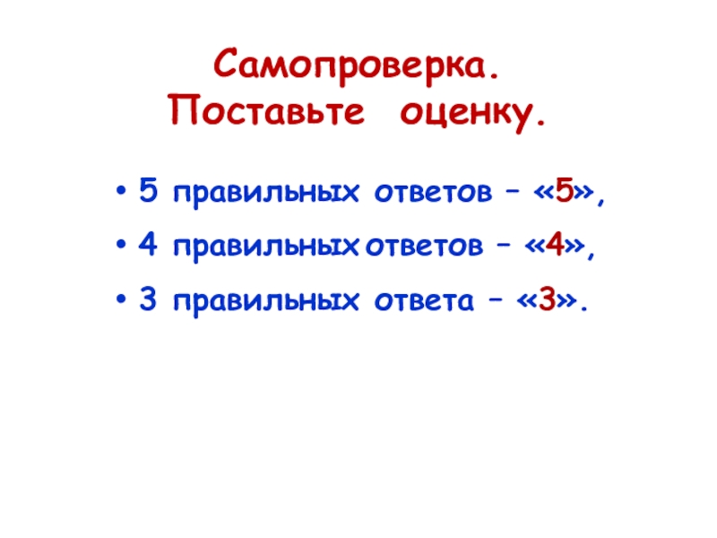 Самопроверка. Поставьте оценку. 5 правильных ответов – «5»,4 правильных ответов – «4»,3 правильных ответа – «3».