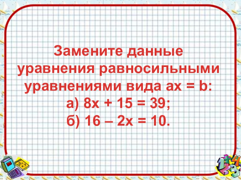 Слайд 15Замените данные уравнения равносильными уравнениями вида aх = b: а) 8х +
