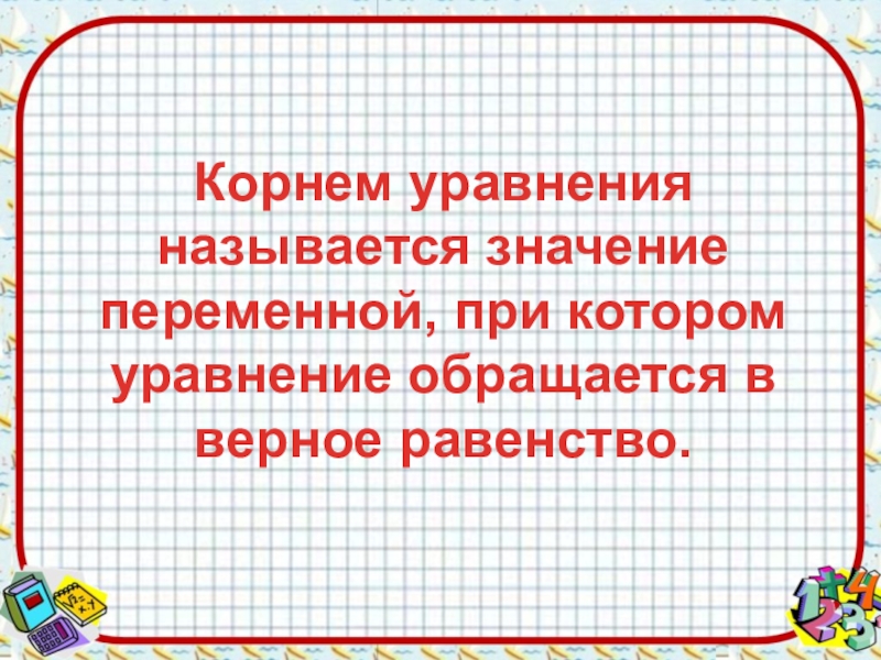 Слайд 4Корнем уравнения называется значение переменной, при котором уравнение обращается в верное