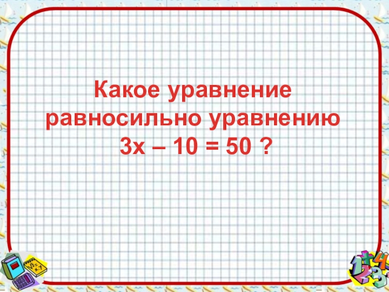 Слайд 12Какое уравнение равносильно уравнению 3х – 10 = 50 ?
