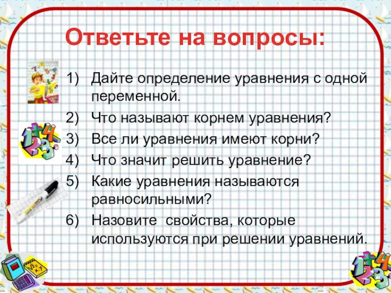Ответьте на вопросы:Дайте определение уравнения с одной переменной.Что называют корнем уравнения?Все ли уравнения имеют корни?Что значит решить