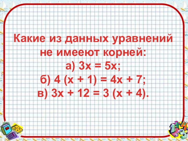 Слайд 9Какие из данных уравнений не имееют корней: а) 3х = 5х; б) 4