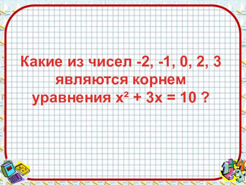 Какие из чисел -2, -1, 0, 2, 3 являются корнем уравнения х² + 3х = 10 ?