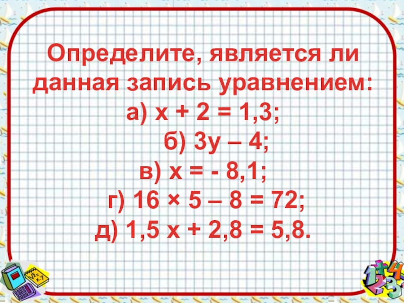 Слайд 3Определите, является ли данная запись уравнением: а) х + 2 = 1,3;