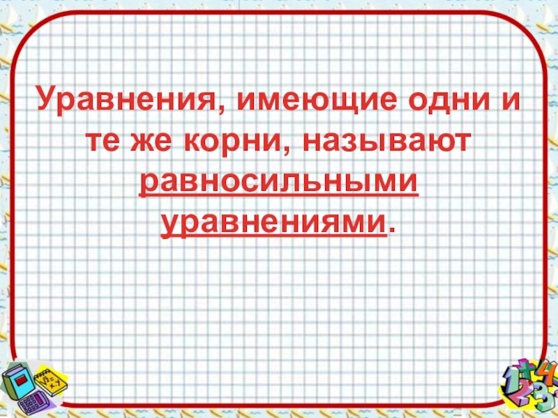Слайд 11Уравнения, имеющие одни и те же корни, называют равносильными уравнениями.