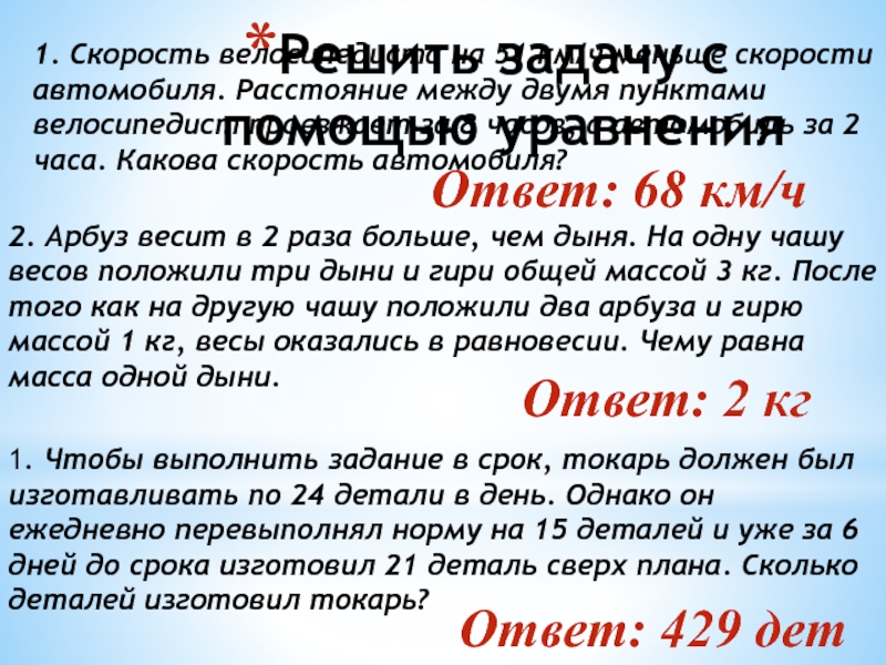 2. Арбуз весит в 2 раза больше, чем дыня. На одну чашу весов положили три дыни и гири общей массой 3 кг. После того как на другую чашу положили два арбуза и гирю массой 1 кг, весы оказались в равновесии. Чему равна масса одной дыни.