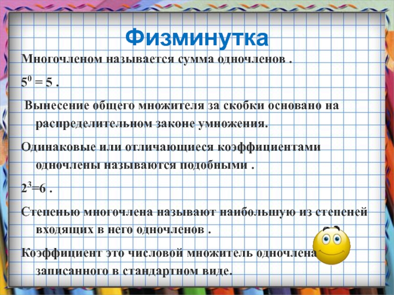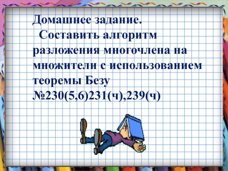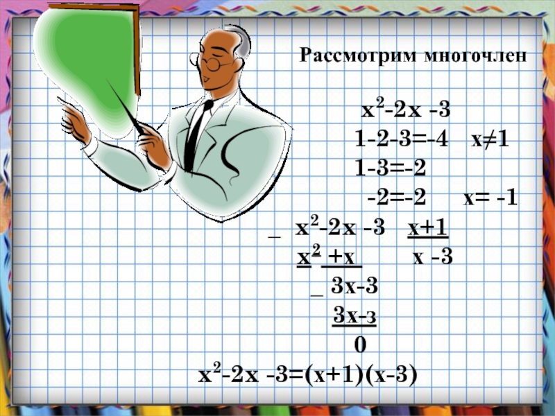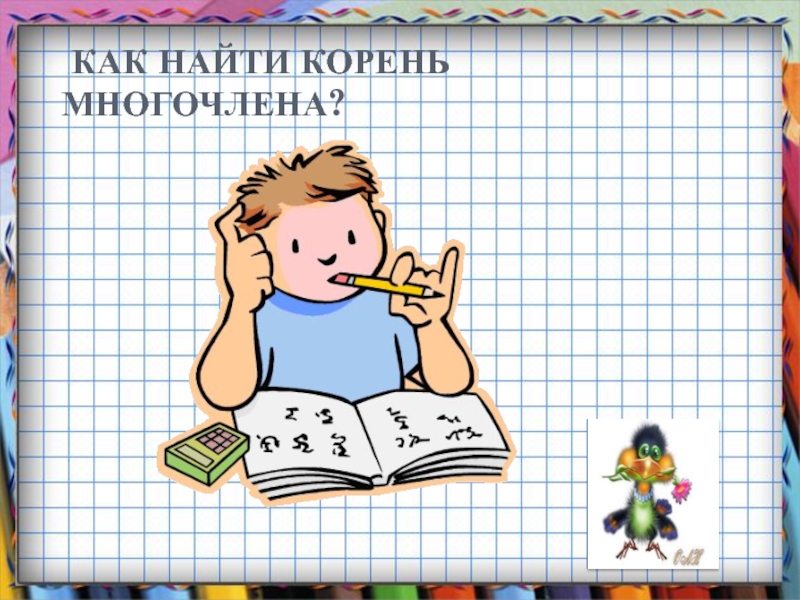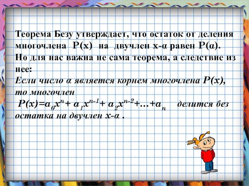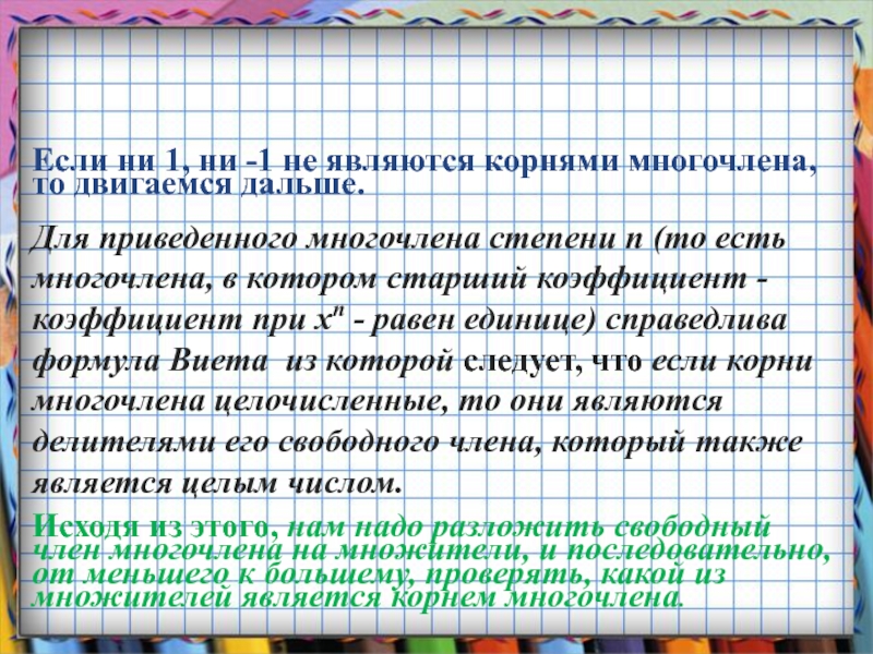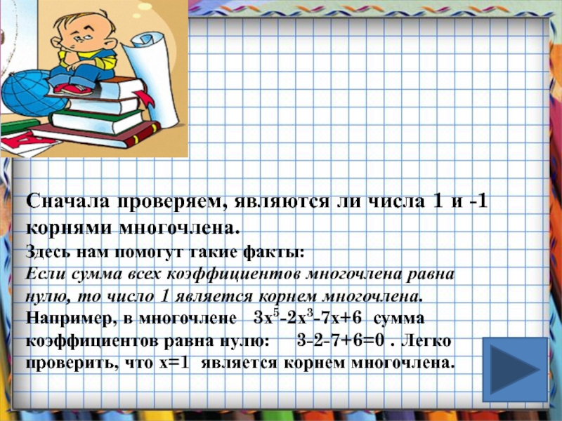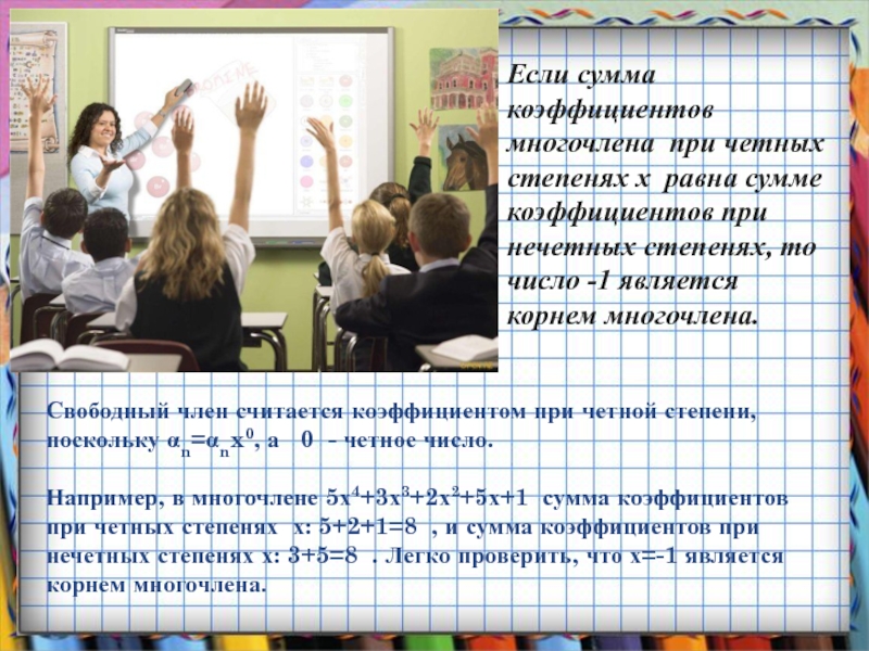 Например, в многочлене 5х4+3х3+2х2+5х+1 сумма коэффициентов при четных степенях х: 5+2+1=8 , и сумма коэффициентов при нечетных степенях х: 3+5=8 . Легко проверить, что х=-1 является корнем многочлена.